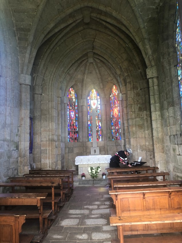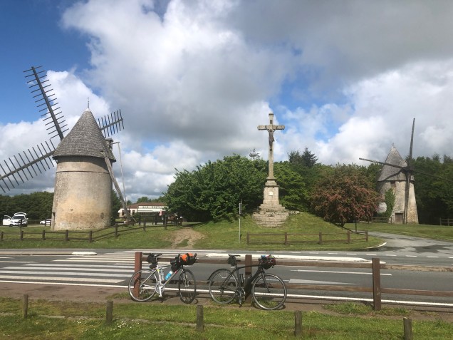 We made a late start after breakfast to allow the heavy rain showers in Les Herbiers to subside. After a few minor diversions caused by timing delays in the GPS app, we found the road North. It was a long but steady climb and we knew it would take us to the highest point of the ride towards Saint-Malo. At the top, there were ancient windmills to the left of us and an ancient church, with the obligatory stained-glass windows, to the right.