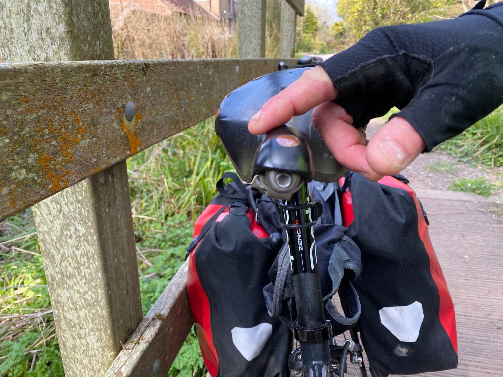 The first day was cool but dry and we enjoyed riding through the most picturesque villages of Wiltshire and Hampshire until Richard noticed his saddle seemed to be stroking the inside of his thigh. While not a sensation to which he would usually object, it clearly indicated a technical problem. In this case, his Brooks B17 saddle (a touring cyclist’s classic) has suffered a broken fixture underneath and was decidedly bent. It was rideable, just, but would need to be replaced.