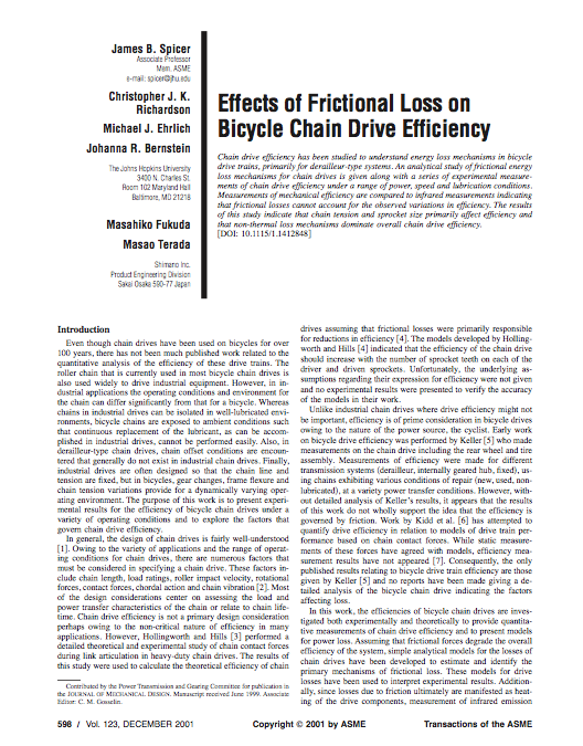 This paper, written in 1999 by members of the American Society of Mechanical Engineers (ASME) throws up some interesting conclusions. The reason that a ‘poor’ chainline is cited as reducing pedalling efficiency is that there is increased friction causing energy to be wasted as heat. The paper doesn’t argue with this point but the conclusion is that these losses are negligible compared with non-thermal losses. The paper describes how an experiment was set up to measure efficiency relating to 3 characteristics of a chain drive: the ratio of sprockets and their relative alignment (chainline), variations in input power and rotation rate (cadence) and lubrication, or lack of it. The detailed results make very interesting reading. The authors concluded that chainline offset and lubrication have a negligible affect on efficiency, at least under laboratory conditions and no significant efficiency differences could be detected between a lubricated and dry chain. (I wonder if a dry chain might actually last longer because grit and grime would not adhere to it and cause greater wear?) The major factors affecting efficiency are spocket size, larger sprockets providing better power transfer, and chain tension. Most importantly, there is a reciprocal linear relationship between chain tension and efficiency, the higher the tension the higher the efficiency. The latter makes a huge difference. With a chain tension of 305N the experiment revealed a drive efficiency of 98.6%. When the tension was reduced to 76.2N, efficiency fell by nearly 18% to 80.9%. Don’t worry about getting your chainline accurate to within mm, don’t worry about lubrication, but do keep the chain well tensioned. I don’t know how the figures above relate exactly to chain slack but 305N is pretty taught!