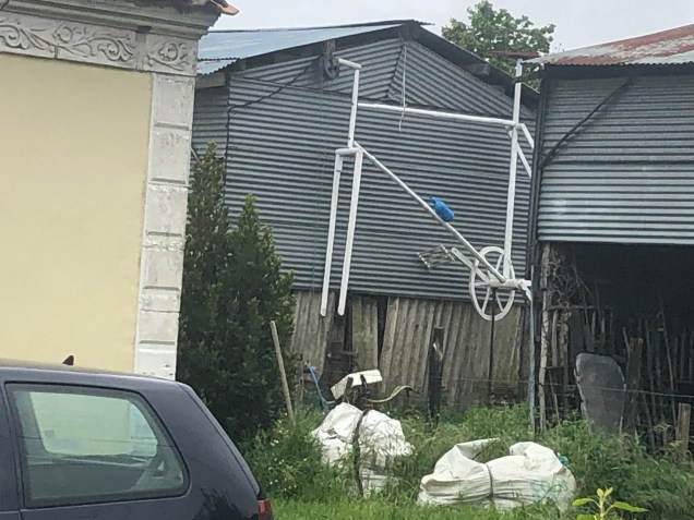 At one point, Andy noticed a huge bicycle frame attached to the side of a building so we went back to photograph it. We’ve no idea who built it or why, and the local guard dog had no intention of letting us in to find out.
